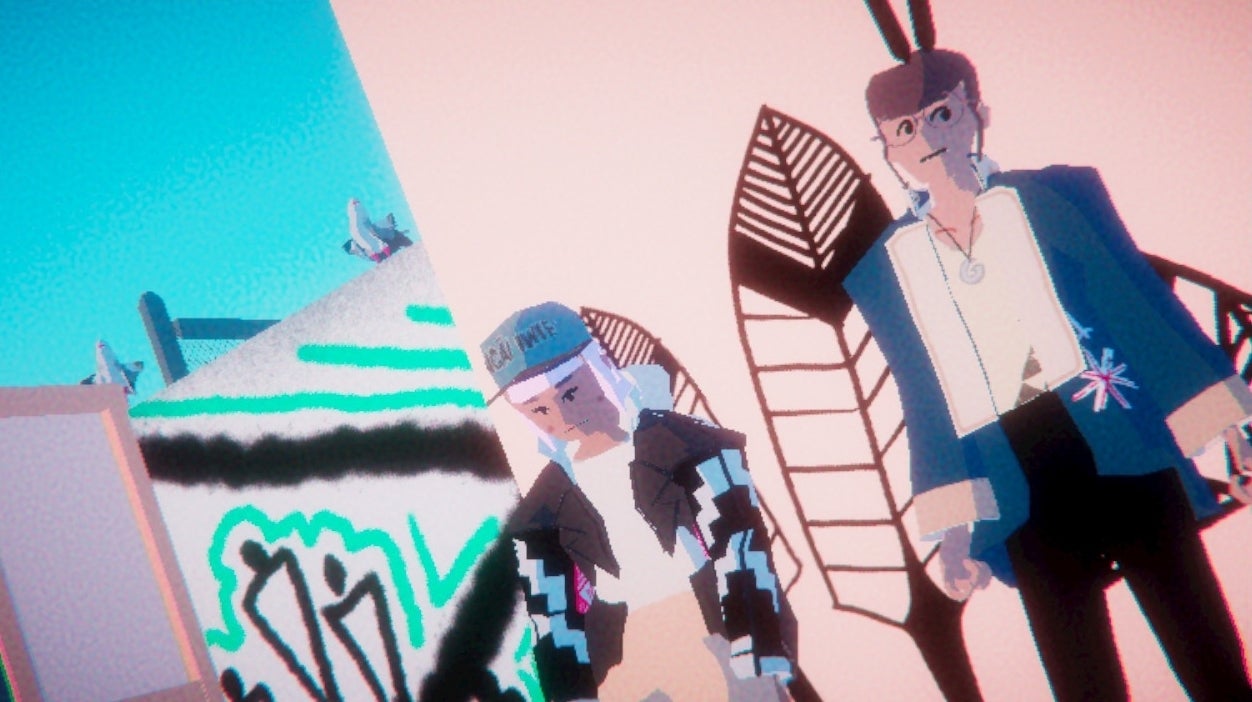 Umurangi Generation is a game about an awful lot of things beyond taking photographs – I am going to have to be selective here. One of the things it’s about is the point at which two worlds intersect. The place you’re dropped into in order to get your photos is Tauranga, Aotearoa, in the grip of a great crisis. The crisis is the stuff of sci-fi, and I won’t spoil it because a lot of the game revolves around teasing it out. But I will say that like so much sci-fi it’s in there to channel stuff that is very real and very topical. Tauranga itself is seen from the perspective of young punks and skaters – a friendly, artsy domestic scrabble of marker pens and spray cans, ramps and tape decks and intricate graffiti designs.